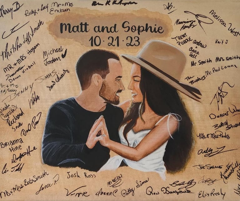 Wedding guest book drawings and paintings: Completely customize your Guestbook from size to image to surface. This service is completed prior to event.